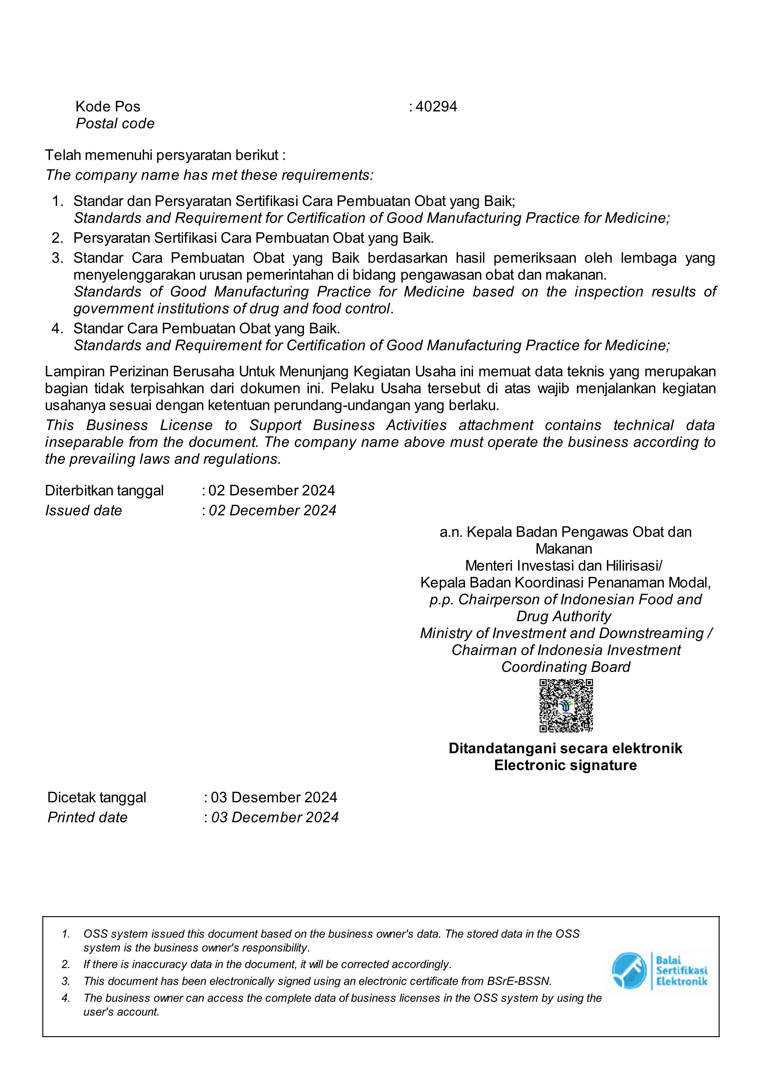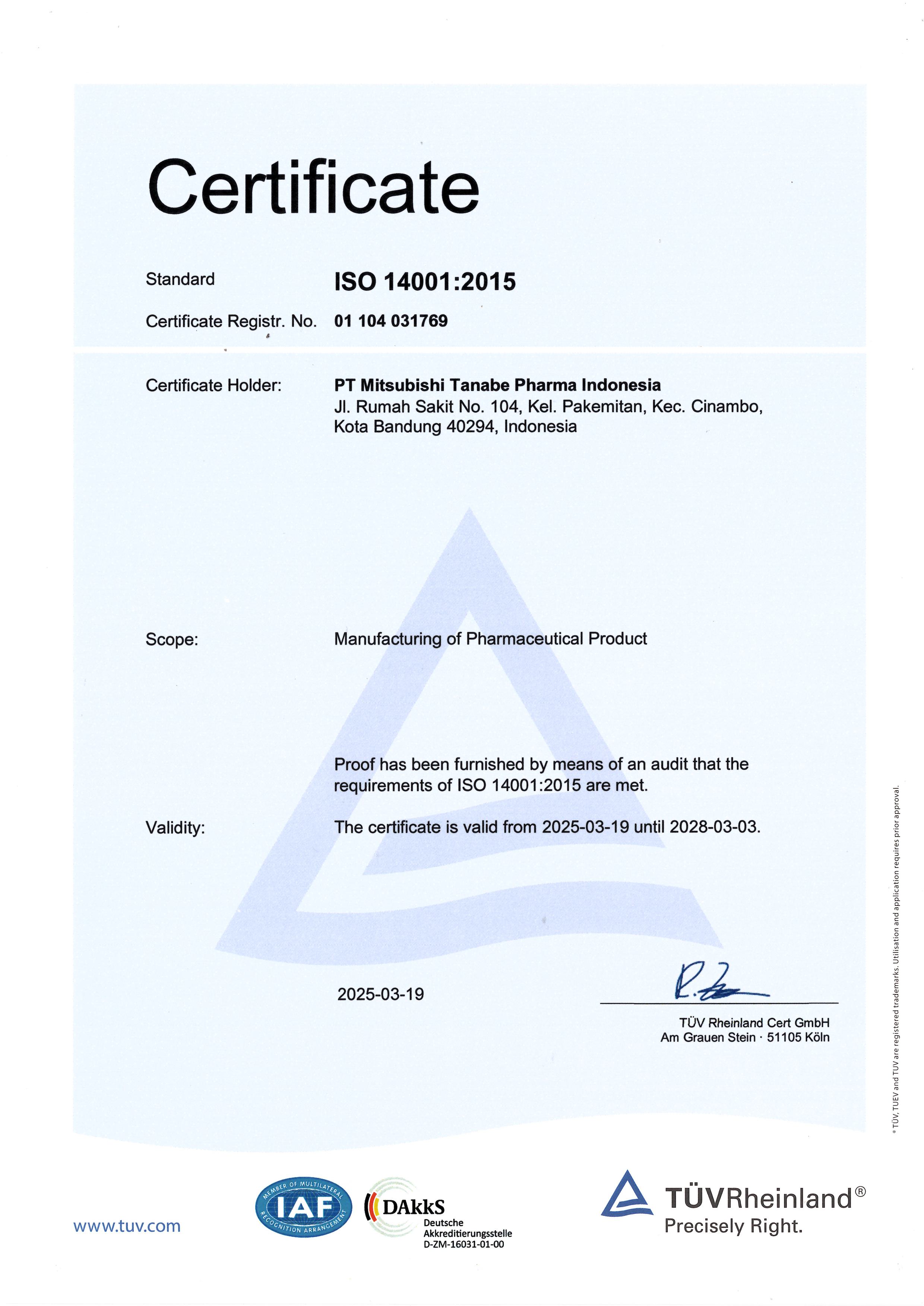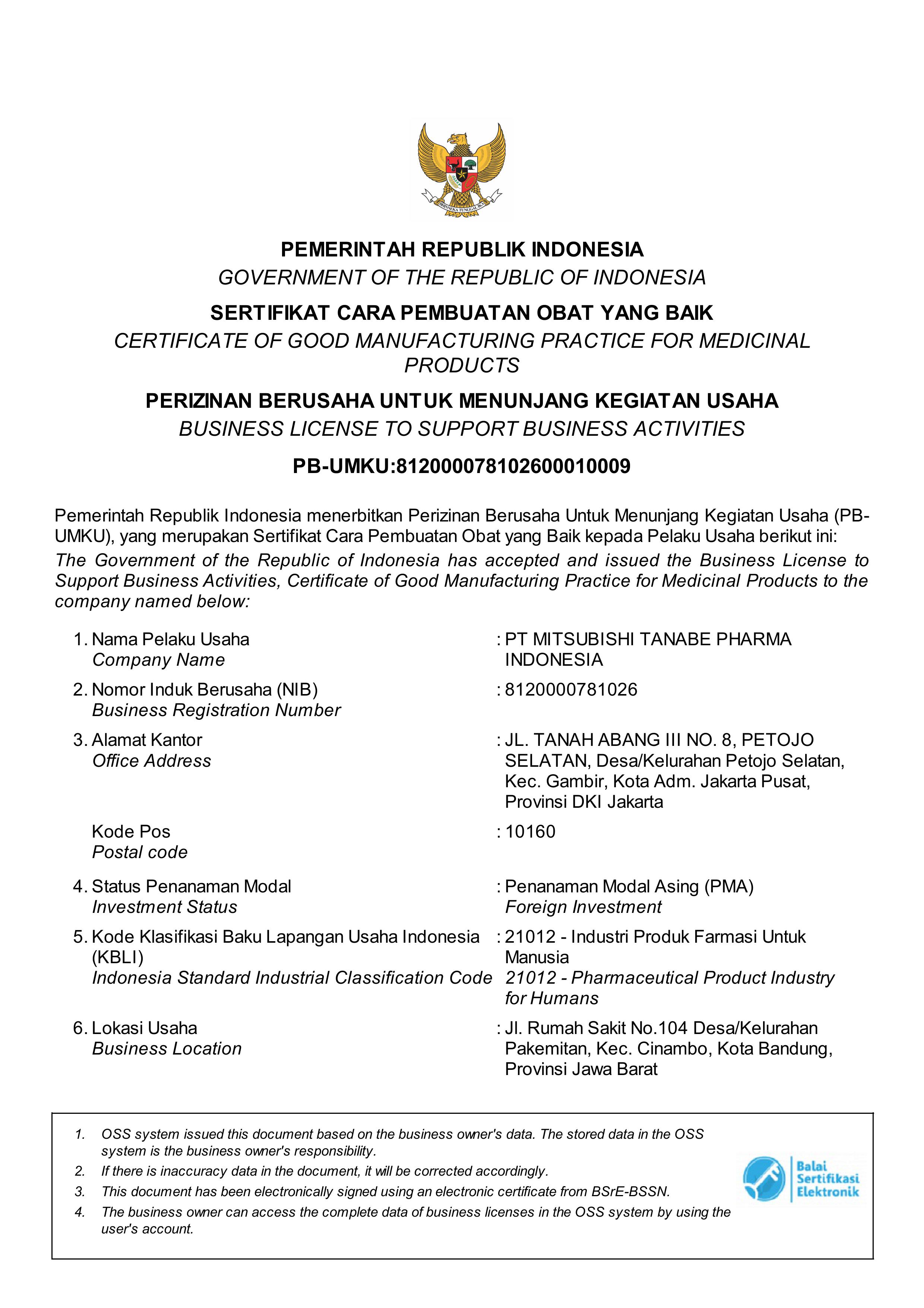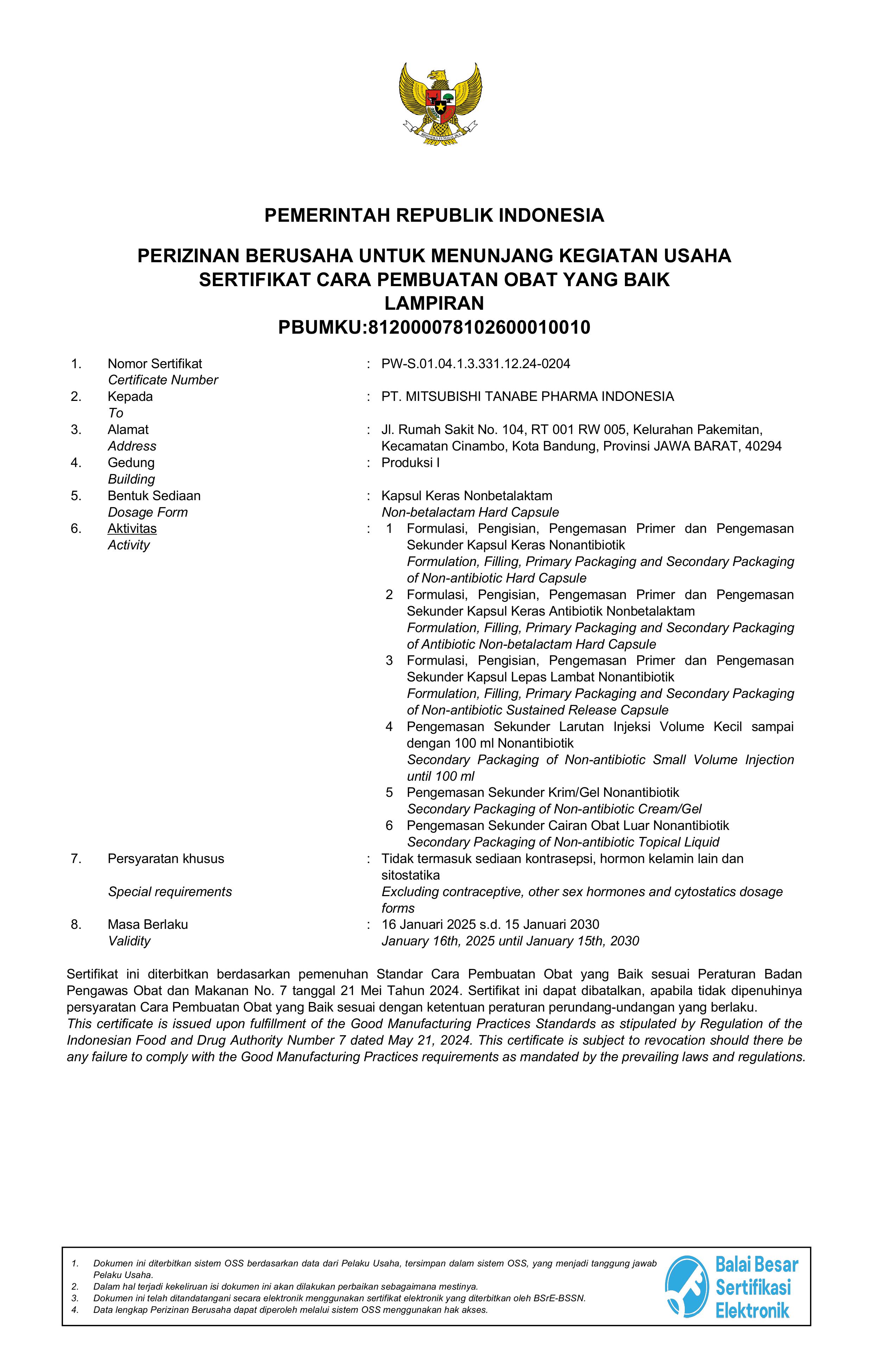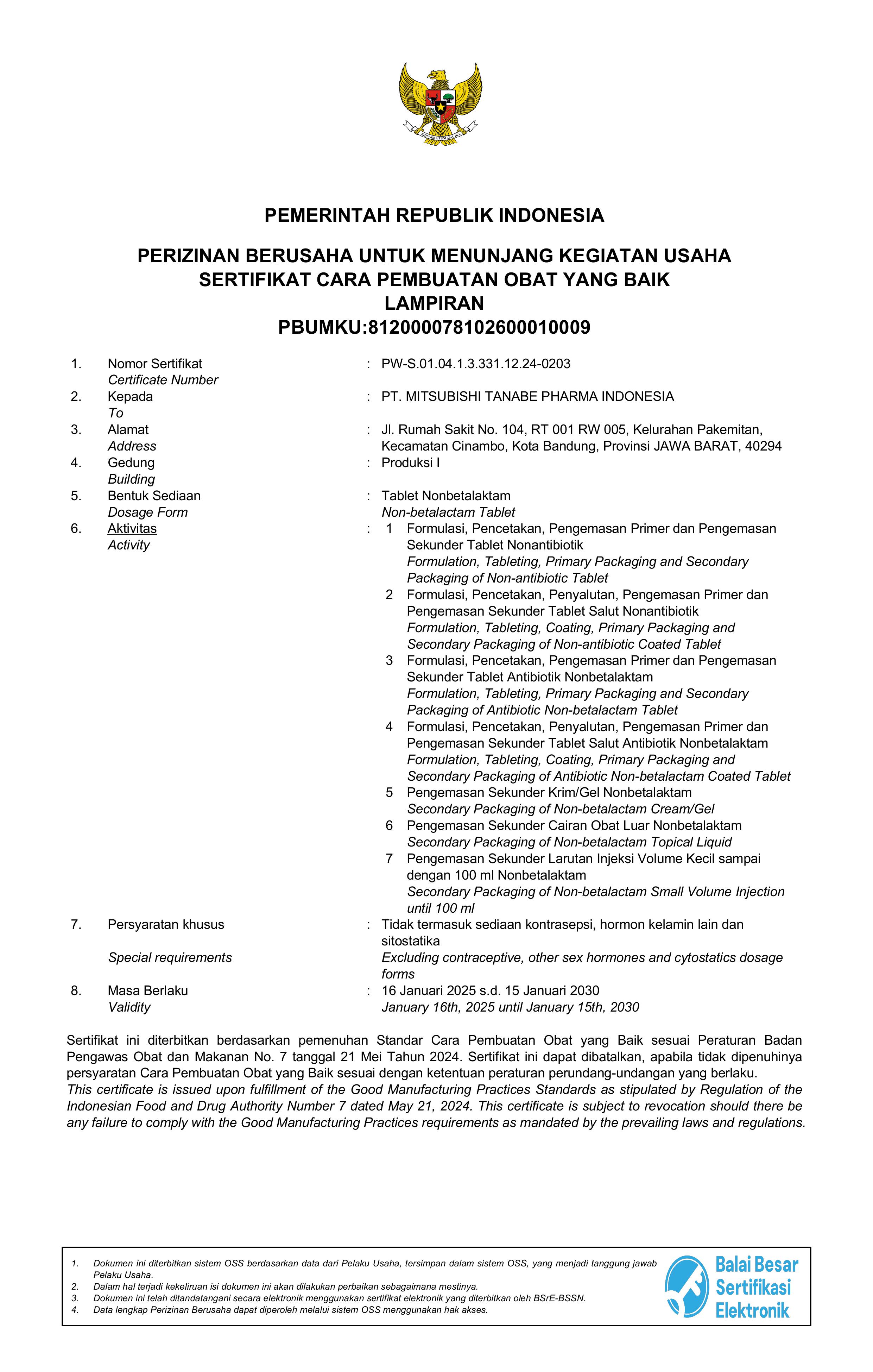 PT Mitsubishi Tanabe Pharma Indonesia (MTID) disertifikasi oleh Badan POM dengan validitas sertifikat dari 16 Januari 2025 hingga 15 Januari 2030.